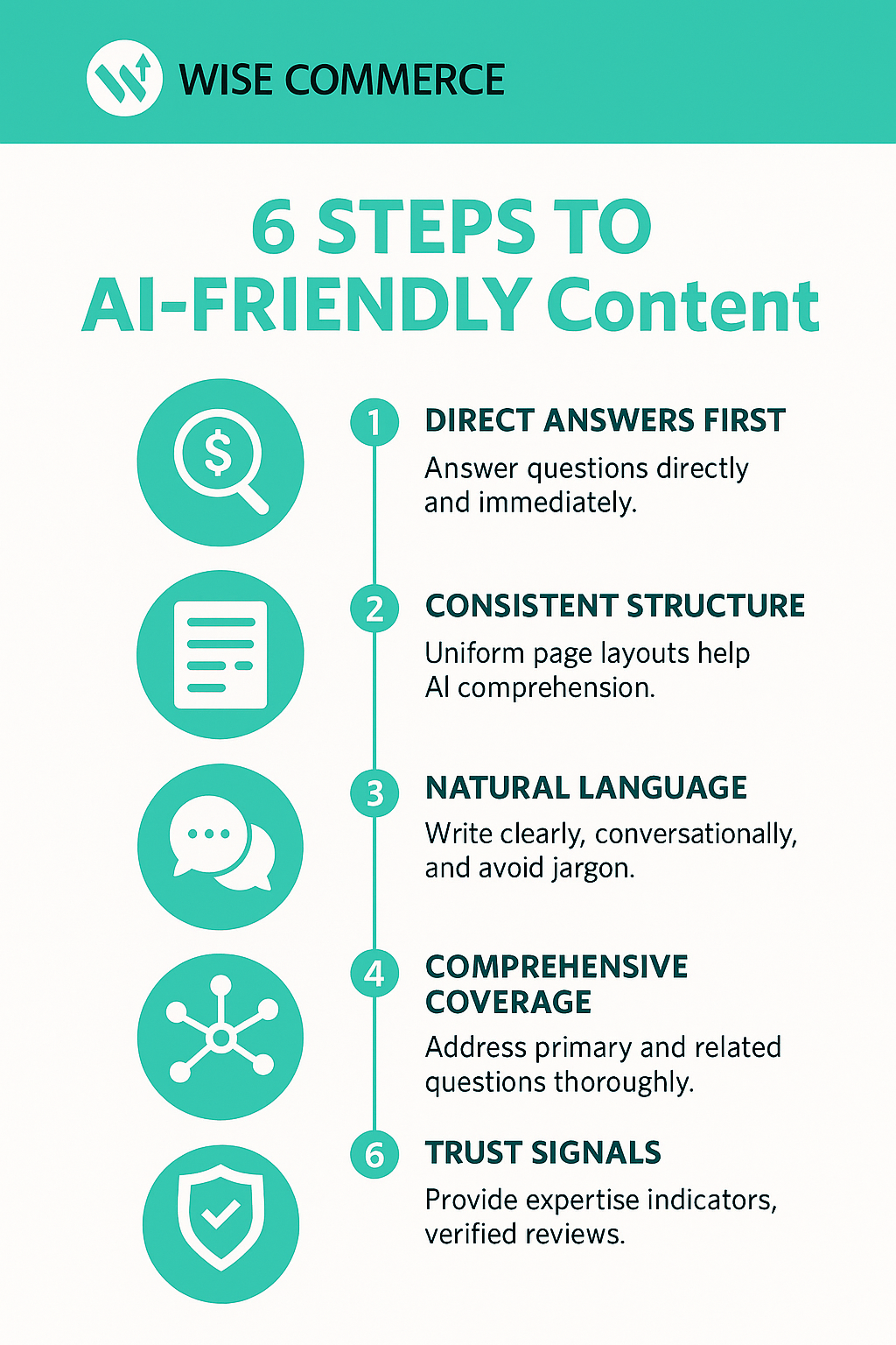 5. Clear Data Structure: Use schema markup to explicitly label prices, availability, and specifications (Google’s Structured Data Guide). Organize content with logical headings (H1 → H2 → H3) that AI can follow.